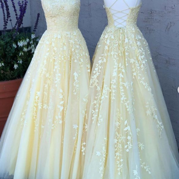 Yellow tulle lace long prom dress, yellow tulle lace formal dress