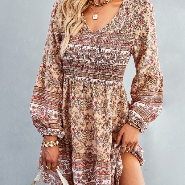 Smock V Neck Floral Print Ruffle Long Puff Sleeve Mini Boho Dress