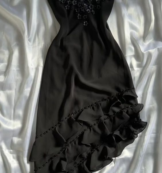 Black Vintage Spaghetti Straps Chiffon Appliques Flower Prom Dress