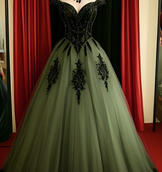 Green A-line Tulle Prom Dress Off The Shoulder Formal Evening Gown