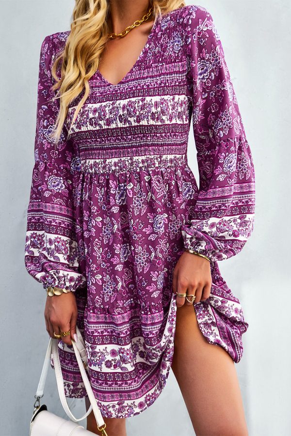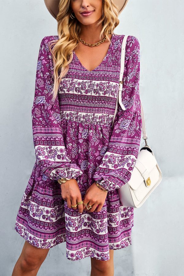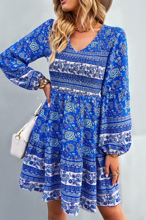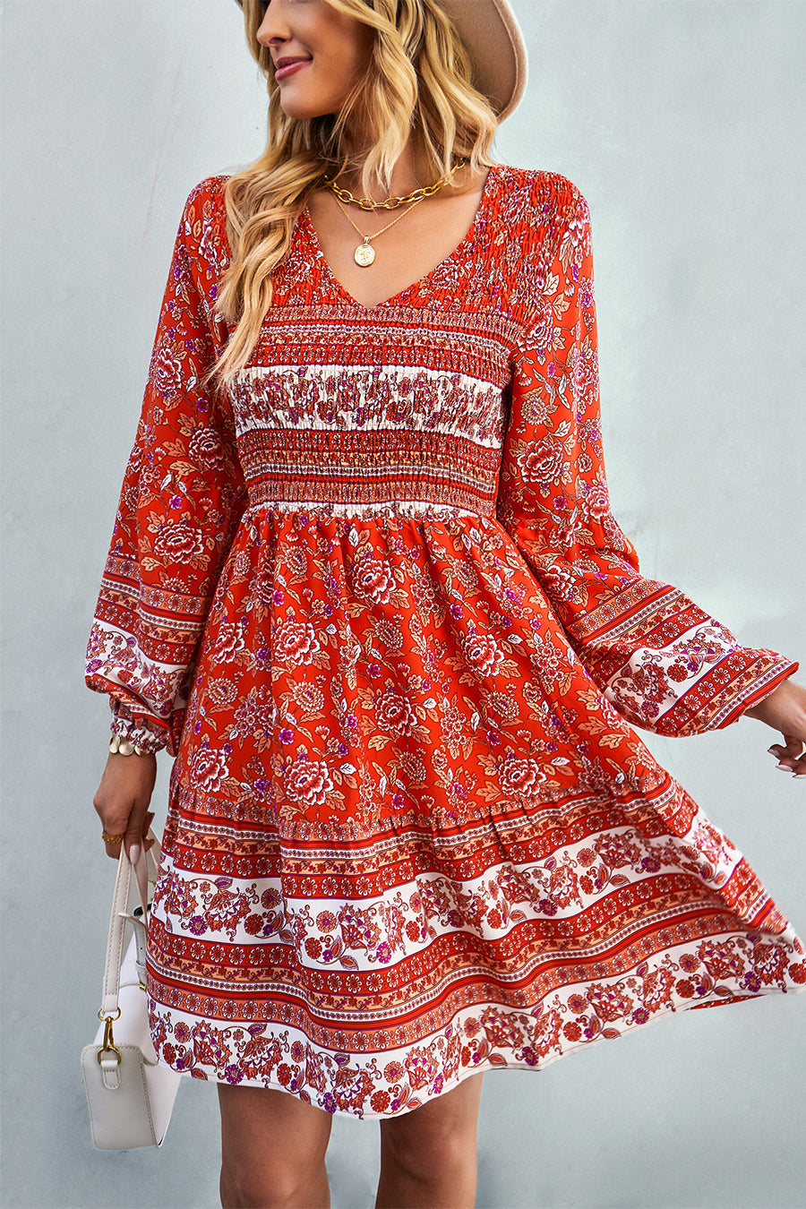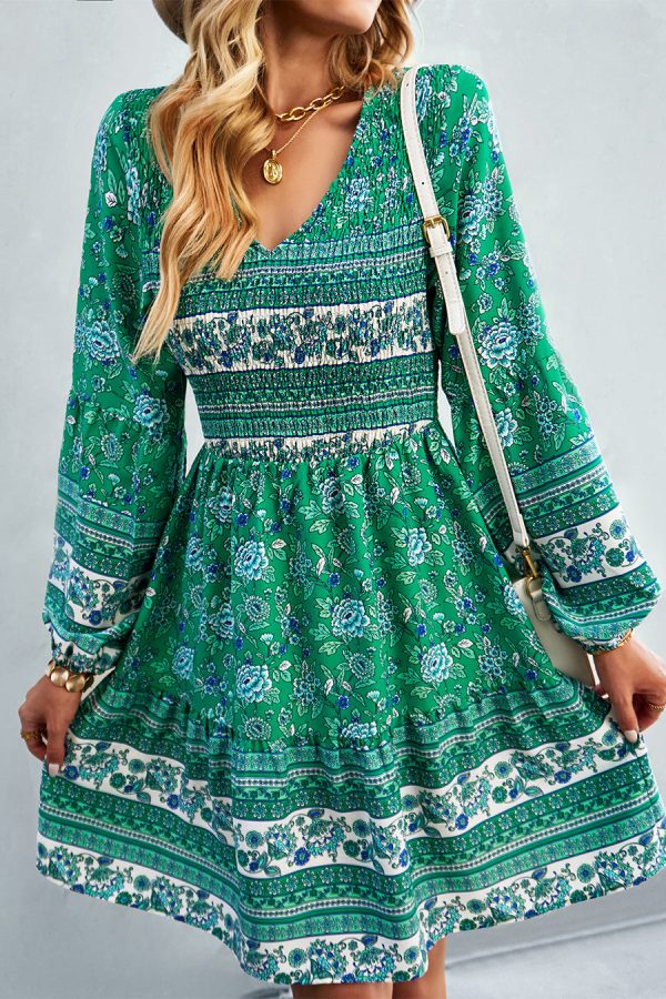 / Smock V Neck Floral Print Ruffle Long Puff Sleeve Mini Boho Dress