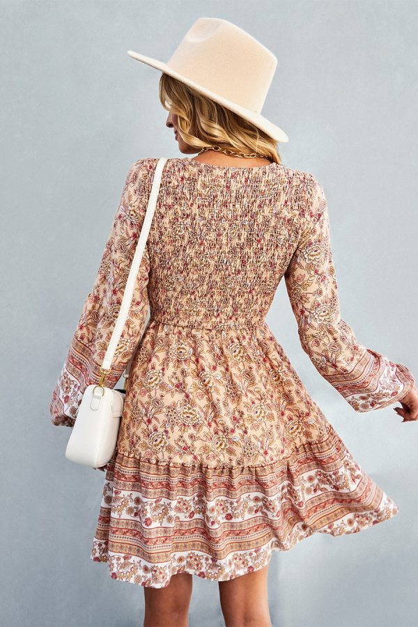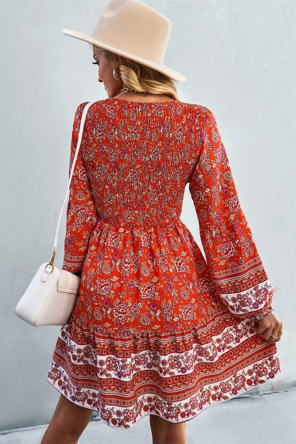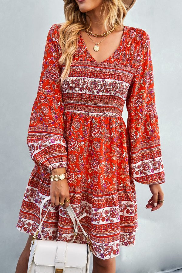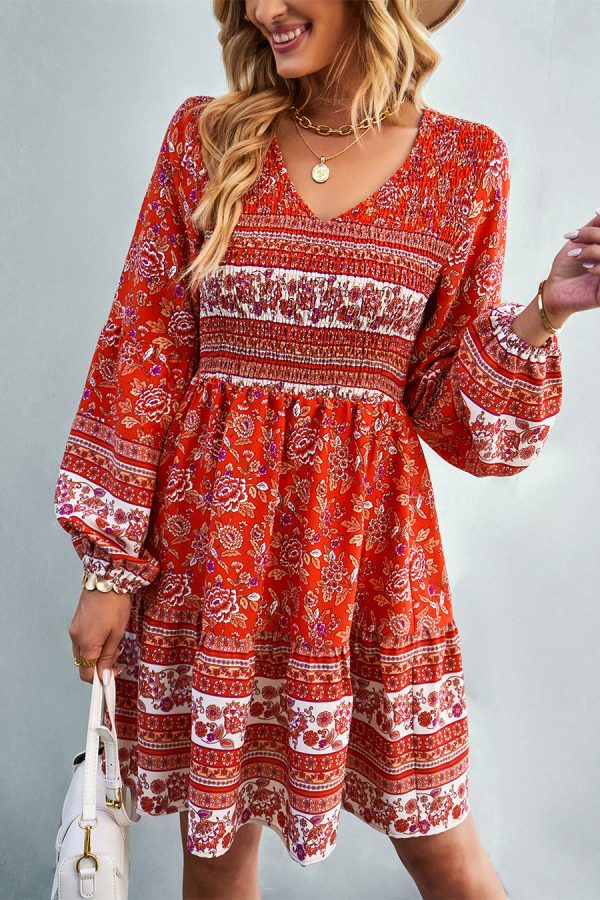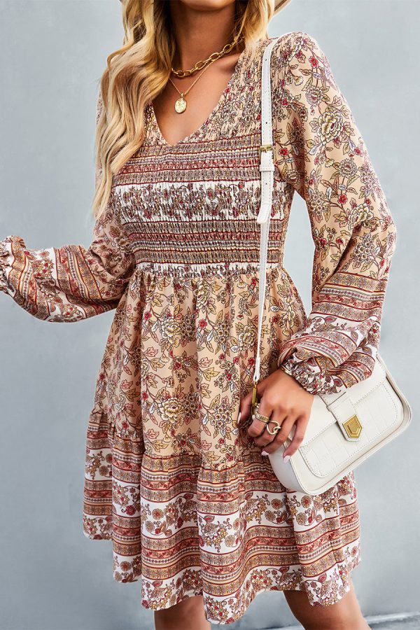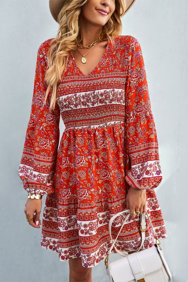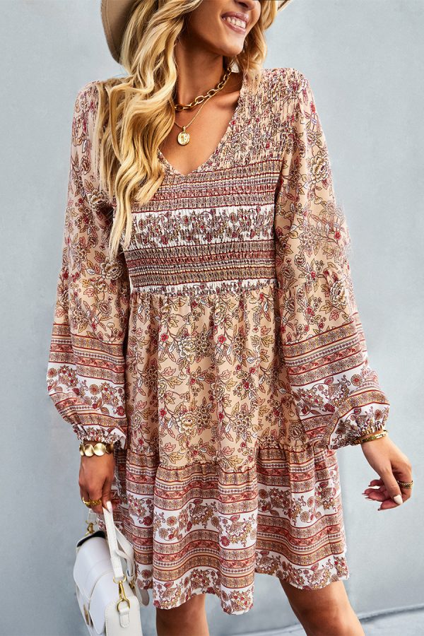 / Smock V Neck Floral Print Ruffle Long Puff Sleeve Mini Boho Dress