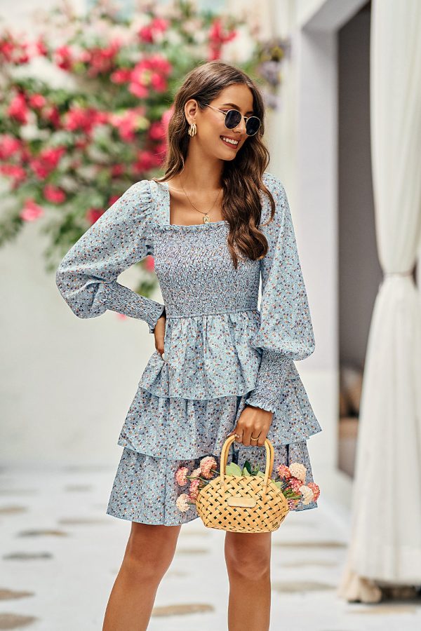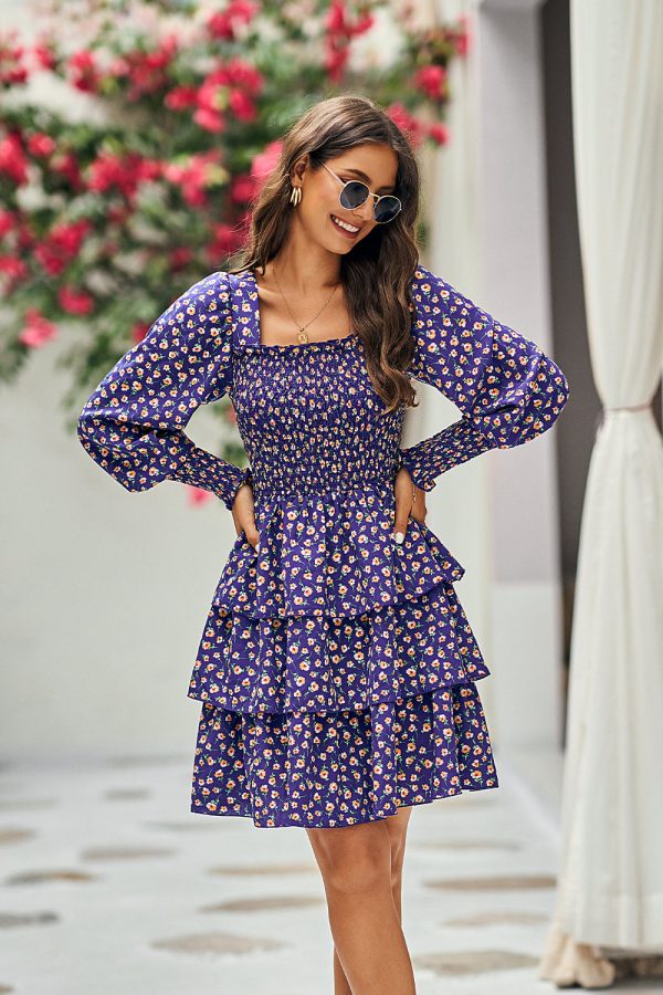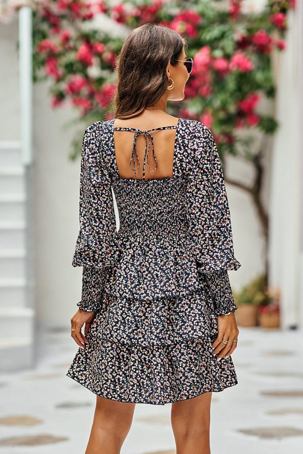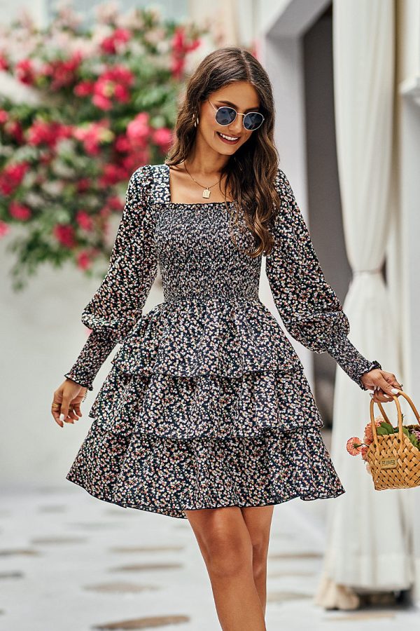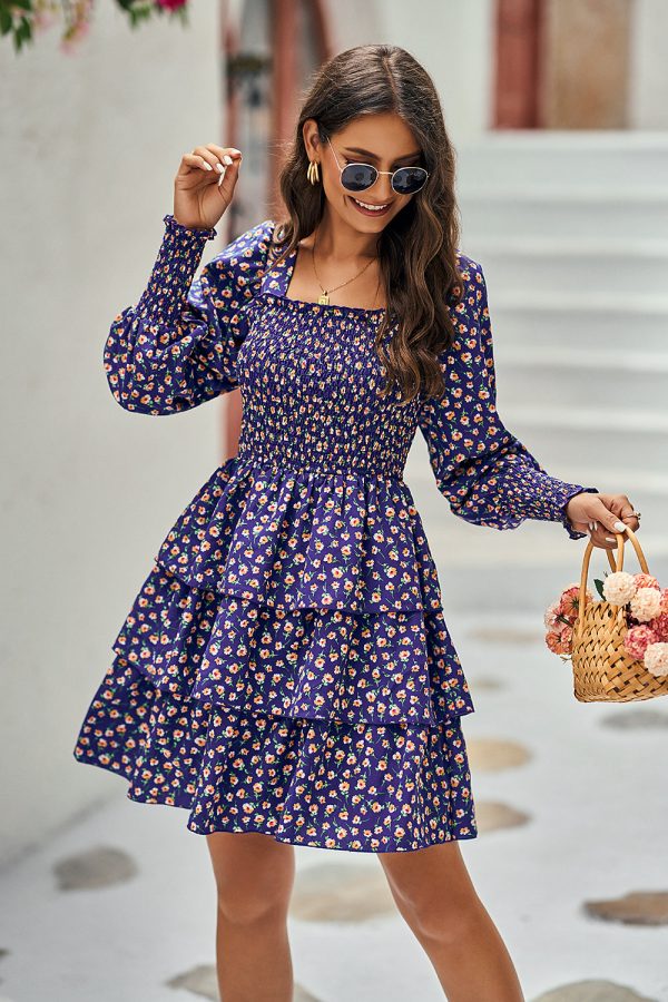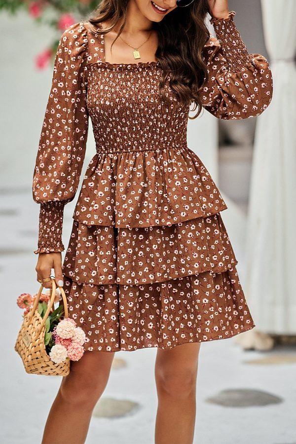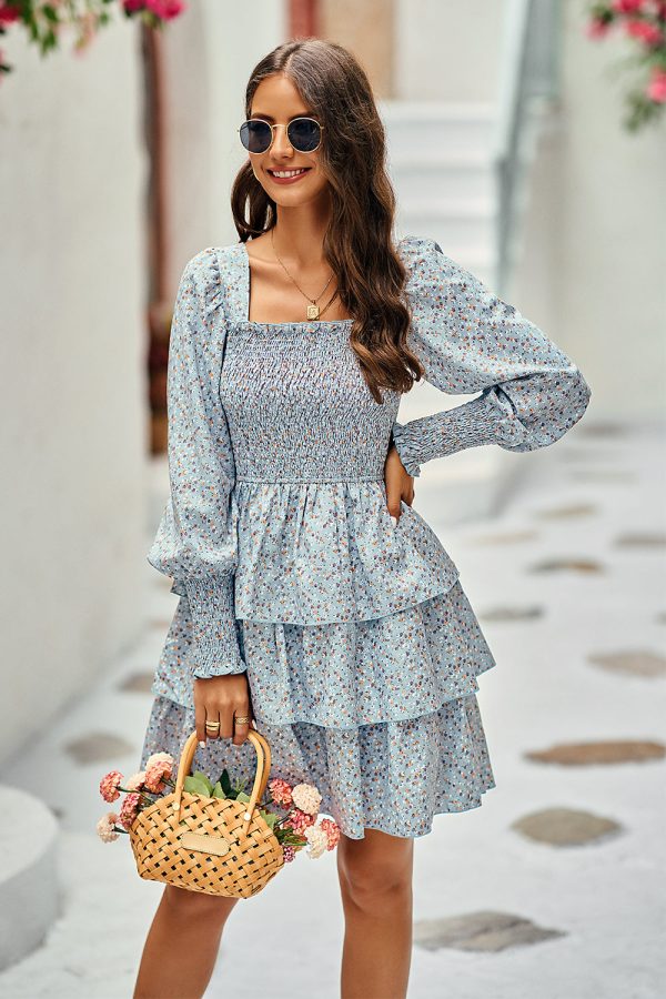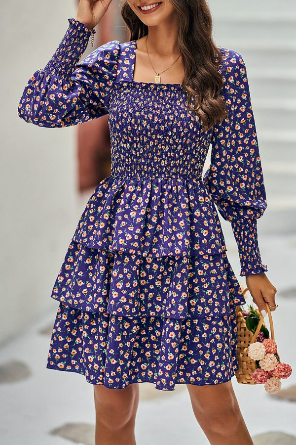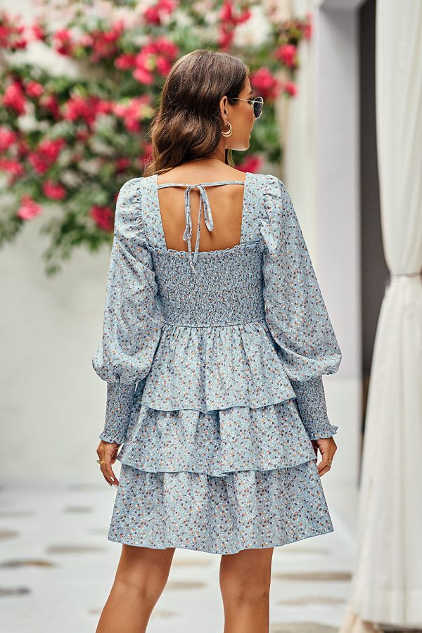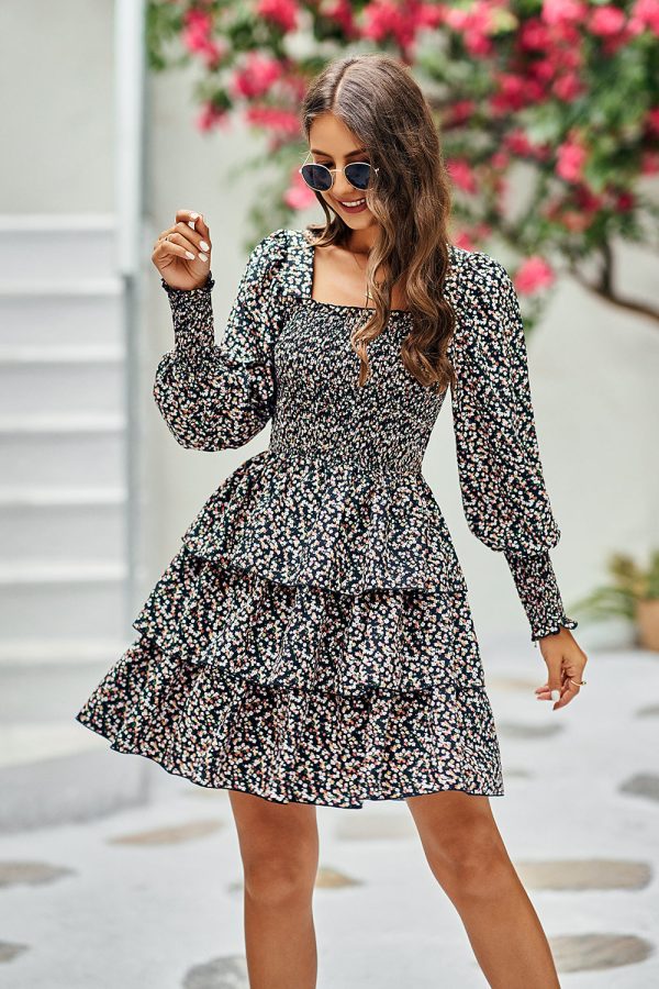 Square Neck Puff Sleeve Flroal Cute Tiered Flowy Dress Mini quantity